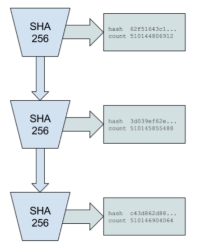 For example: PoH Sequence Index Operation Output Hash 1 sha256(”any random starting value”) hash1 2 sha256(hash1) hash2 3 sha256(hash2) hash3